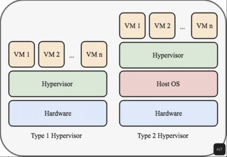 [ Hardware ] ↓ [ Hypervisor ] ↓ [ VM1 | VM2 | VM3 ]