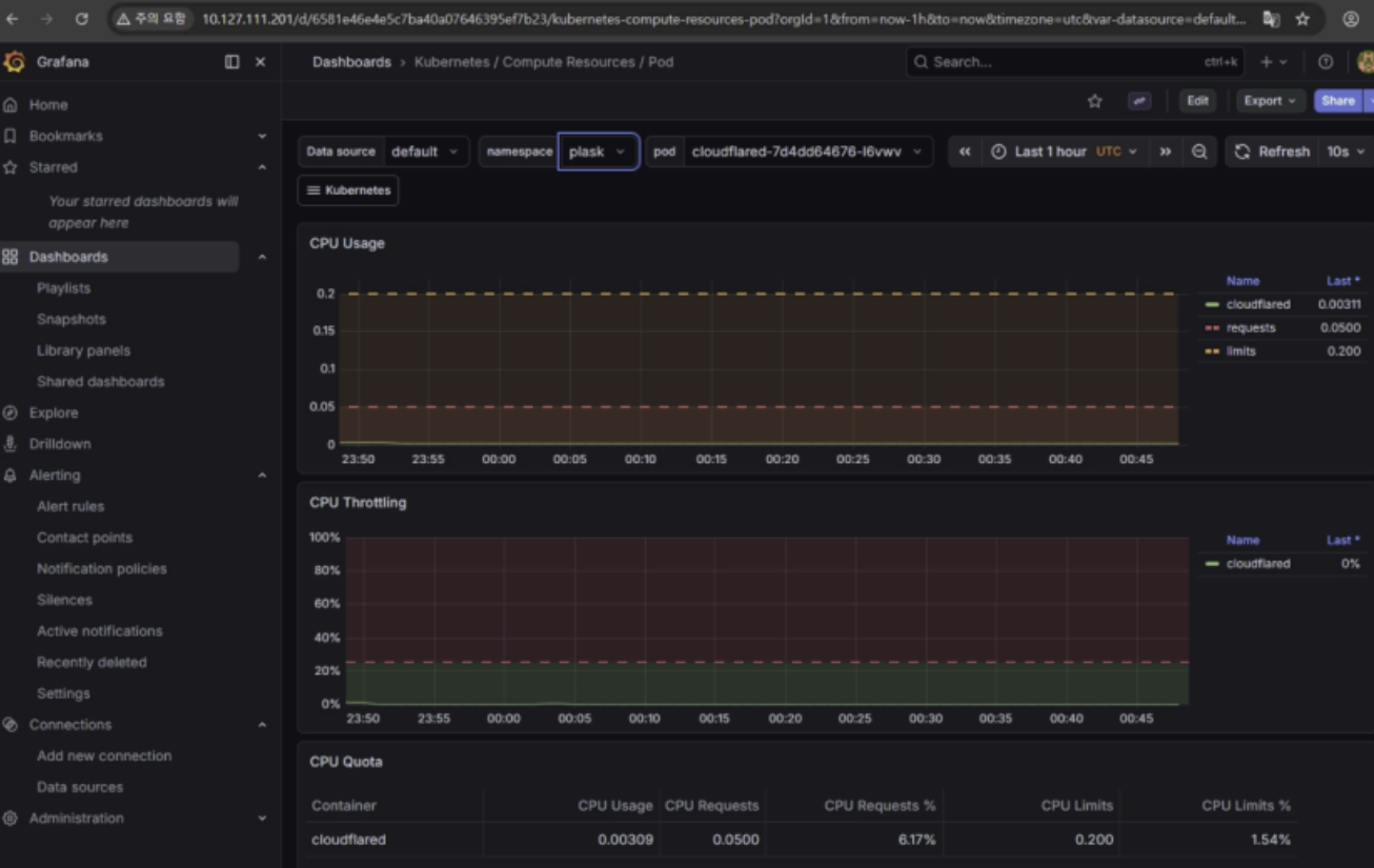 | 모니터링 | 별도 도구 없음, 수동 확인 | Prometheus + Grafana 실시간 | 문제 사전 인지 가능 |