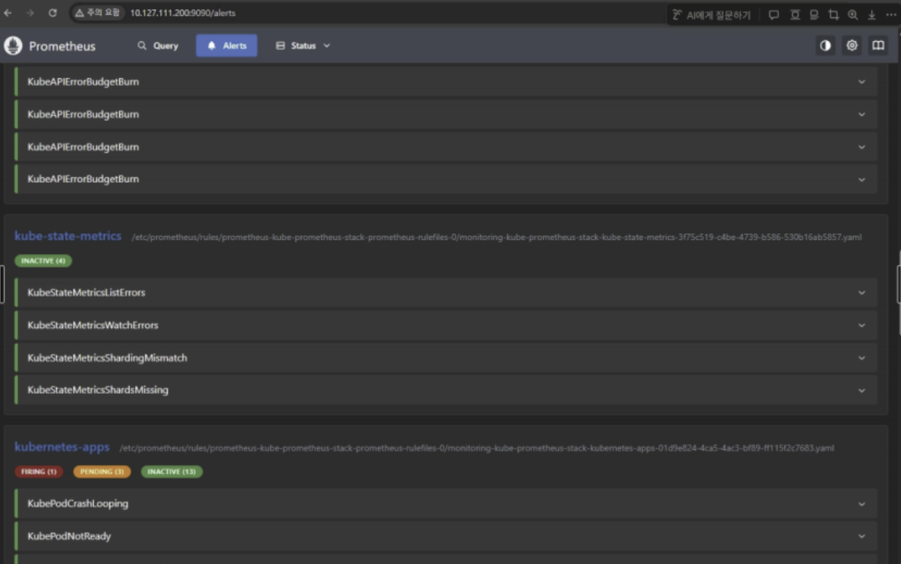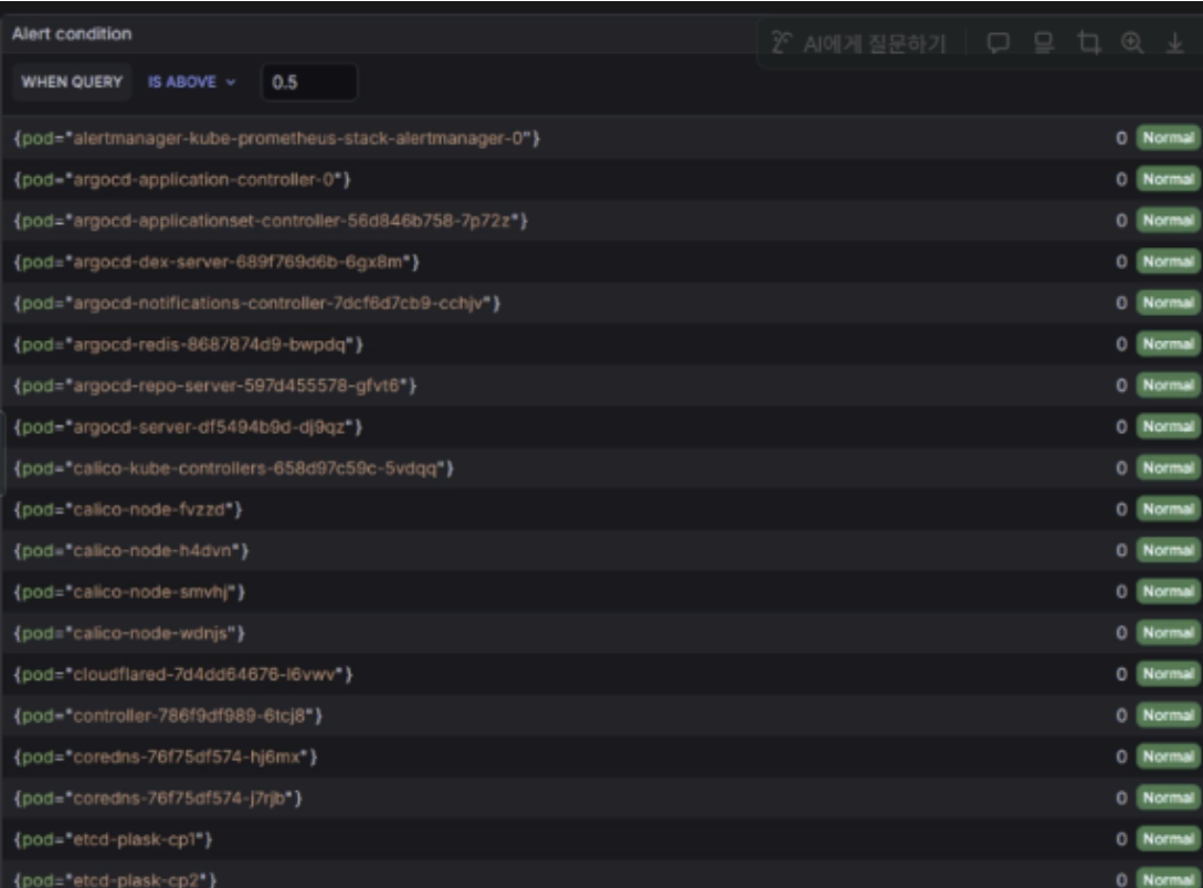 | Pod 상태 | CrashLoopBackOff, OOMKilled 등 비정상 상태 즉시 Alert |