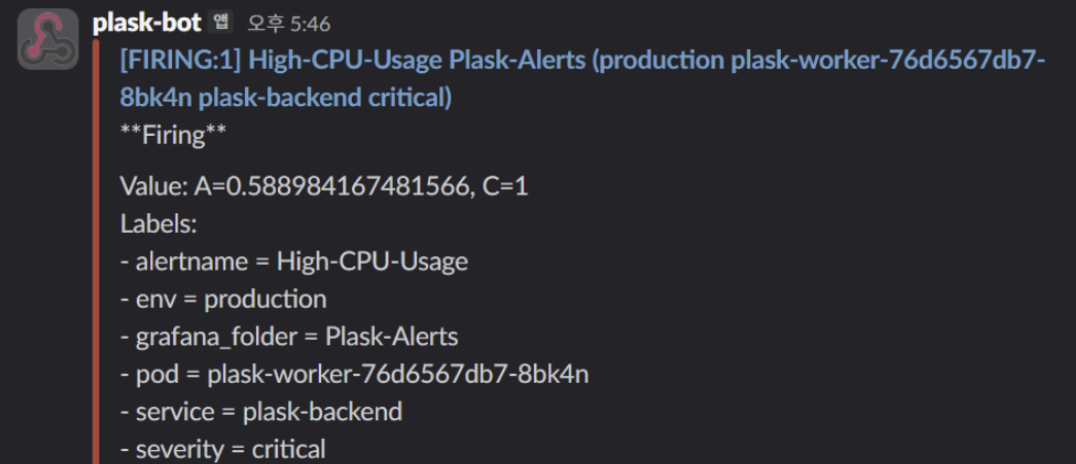 - Alertmanager : 정의된 임계값 초과 시 Slack 채널로 실시간 알림 발송