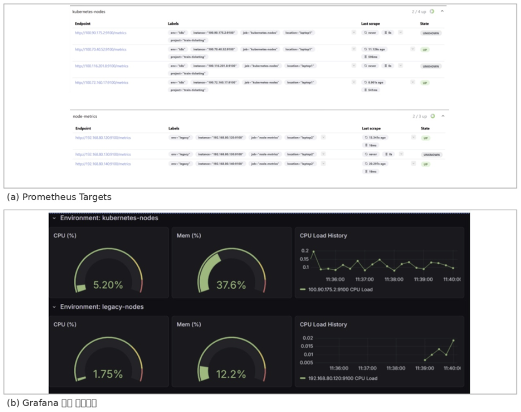 Prometheus에서는 Kubernetes 노드를 kubernetes-nodes, 레거시 노드를 node-metrics 그룹으로 분리하여 수집하였다. Grafana에서는 두 환경의 CPU, Memory, CPU Load를 동일 레이아웃으로 배치하여 한 화면에서 비교할 수 있도록 구성하였다.