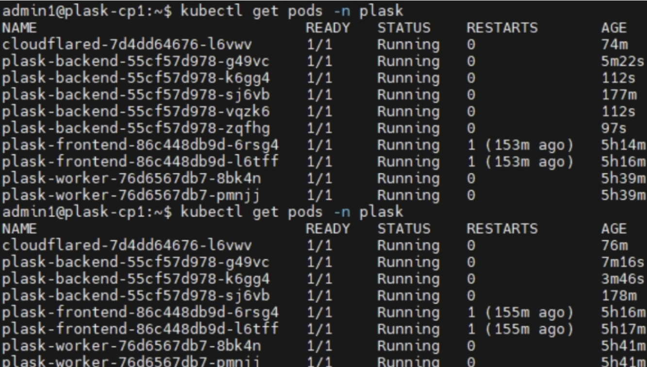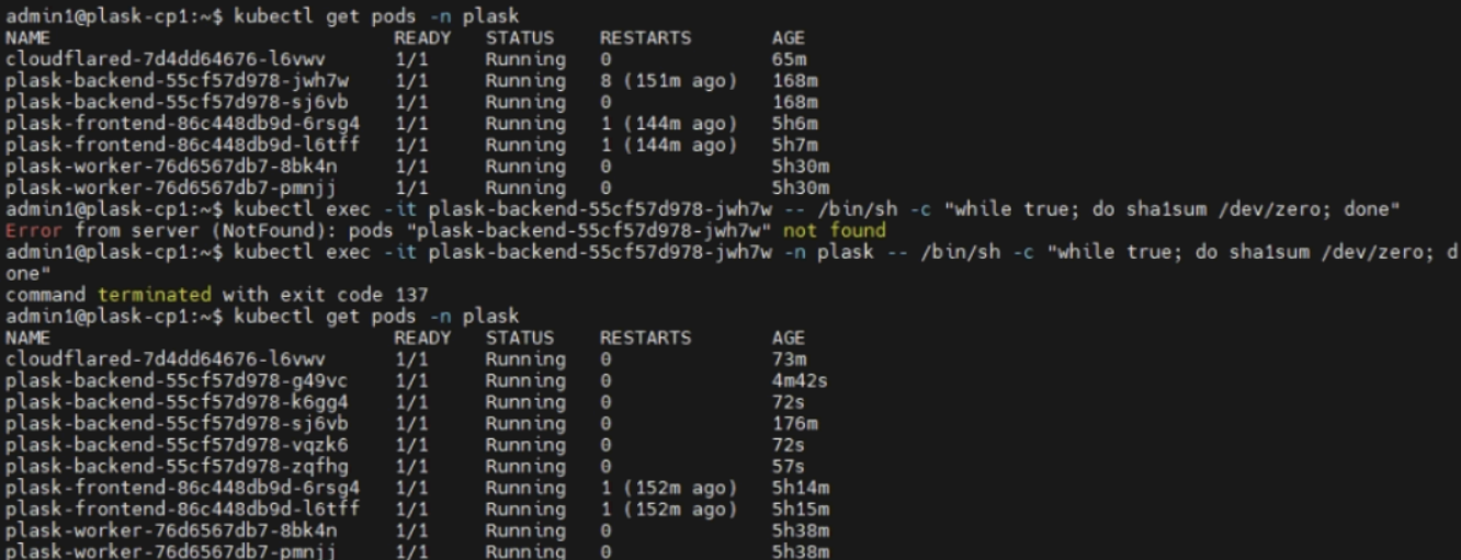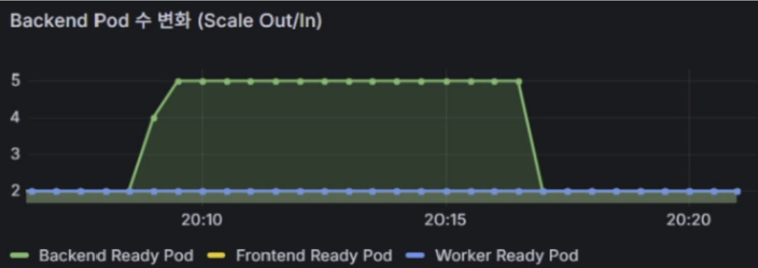검증 내용 : 트래픽이 몰려 CPU 사용률이 목표 임계치(70%)에 도달했을 때, 시스템이 이를 감지하고 자동으로 Backend Pod의 개수를 늘려(Scale Out) 부하를 방어하고, 트래픽이 빠지면 다시 줄어드는 것을(Scale In) 실시간으로 확인하였다. 부하 시작 후 약 2분 뒤 CPU 70% 초과를 감지하여 Scale Out이 시작되었으며, Pod 5개 Ready 완료까지 약 30초가 소요되었다.