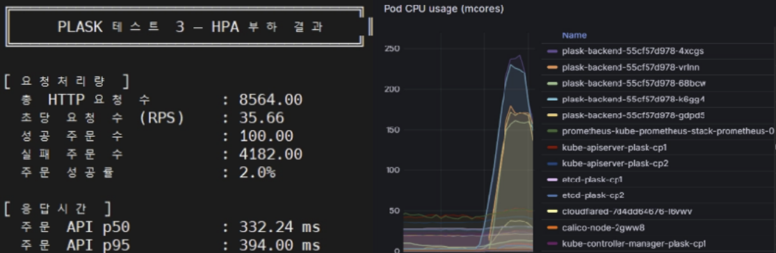 | CPU 최대 사용률 | 166~190% (포화) | HPA 분산 처리 | ✅ 부하 안정화 |