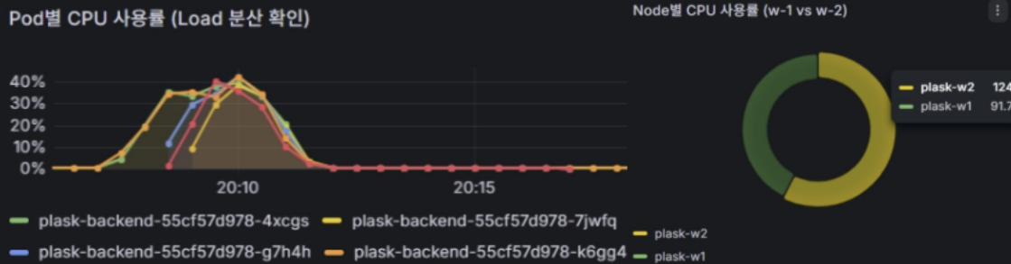 검증 내용 : 기존 Pod 2개에서 Scale Out 후 35~40%로 균등 분산되어 새로 생성된 여러 개의 Pod들에 트래픽이 한쪽으로 쏠리지 않고 균등하게 분배되는 패턴을 확인하였으며, 물리적 서버인 Node(w-1, w-2) 레벨에서도 한쪽 노드만 과부하에 걸리지 않고 안정적으로 자원을 나누어 쓰고 있는 것을 수치로 확인하였다.