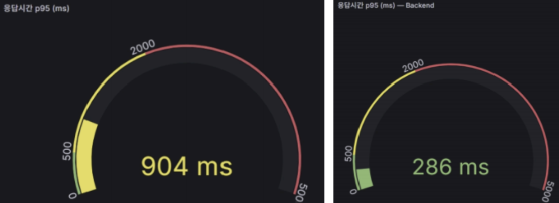 검증 내용 : 왼쪽은 3-Tier 초기 버전(v1), 오른쪽은 Kubernetes 버전(v2)의 p95 응답시간 게이지이다. v1은 p95 응답시간이 904ms로 노란색 경고 구간에 도달한 반면, v2는 286ms로 초록색 정상 구간을 유지하고있다. 동일한 부하 조건에서 사용자가 체감하는 서비스 안정성이 향상되었음을 확인할 수 있다.