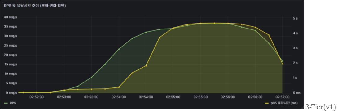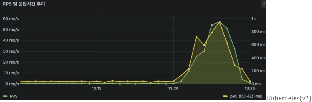검증 내용 : v2는 RPS가 최대 5 req/s까지 상승하는 상황에서도 p95 응답시간이 800ms 수준으로 제어되었으며 부하 종료 후 즉시 안정화되었다. 반면 v1은 RPS 35 req/s 수준에서도 p95 응답시간이 5초까지 계속 상승하며 요청이 끝날때까지 회복되지 않았다. v2가 더 높은 RPS를 처리하면서도 응답시간을 낮게 유지한 것은 HPA 자동 확장을 통해 부하를 분산한 결과이다.